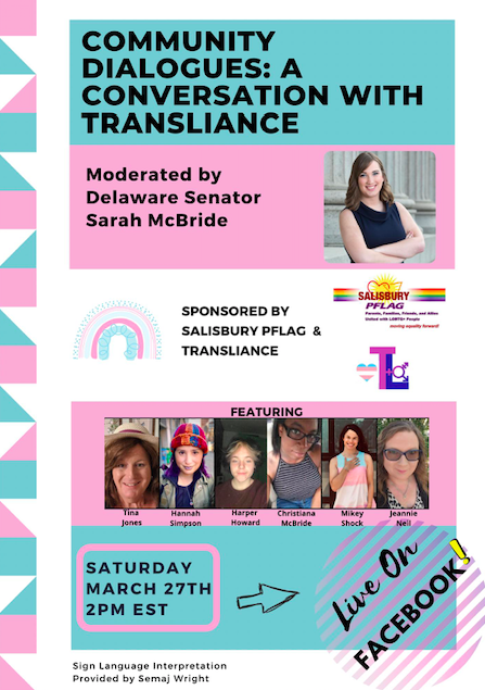 Mikey Shock is speaking on a panel of other people in the transgender community, moderated by Senator Sarah McBride. Panelists include Tina Jones, Hannah Simpson, Harper Howard, Christiana McBride, Jeannie Neil. Sign language interpretation will be provided by Semaj Wright.